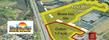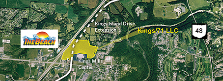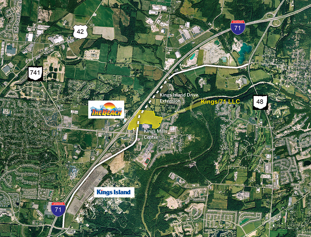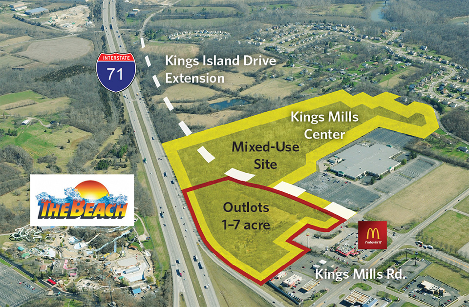 Kings Mills Center is a 52 acre development located at the interchange of I-71 and Kings Mills Road. This interchange also serves Kings Island Amusement Park and the Great Wolf Lodge which attract over 4 million visitors per year. This area, including the adjacent City of Mason, has experienced some of the fastest population growth rates in the entire state for the last 30+ years. The property is zoned for retail use and is planned to include hotels and restaurants, but is suitable for a variety of uses.